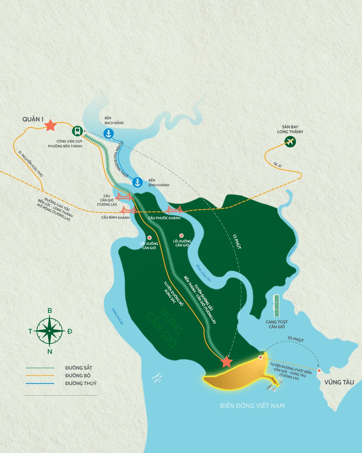 Vị trí Vinhomes Green Paradise nằm tại Long Hòa và thị trấn Cần Thạnh, huyện Cần Giờ, TP.HCM – khu vực được xem là cực phát triển phía Nam của toàn thành phố. Sở hữu vị trí đắc địa ven biển đầy tiềm năng, bao quanh bởi rừng ngập mặn Cần Giờ – di sản được UNESCO công nhận, dự án Vinhomes Green Paradise không chỉ dễ dàng khai thác nghỉ dưỡng mà còn đáp ứng chiến lược đầu tư dài hạn. Trong bối cảnh TP.HCM thiếu vắng những đô thị biển quy mô, vị trí dự án trở thành yếu tố cốt lõi để thu hút nhà đầu tư, nhất là khi hạ tầng giao thông khu vực Cần Giờ đang được đẩy mạnh phát triển.